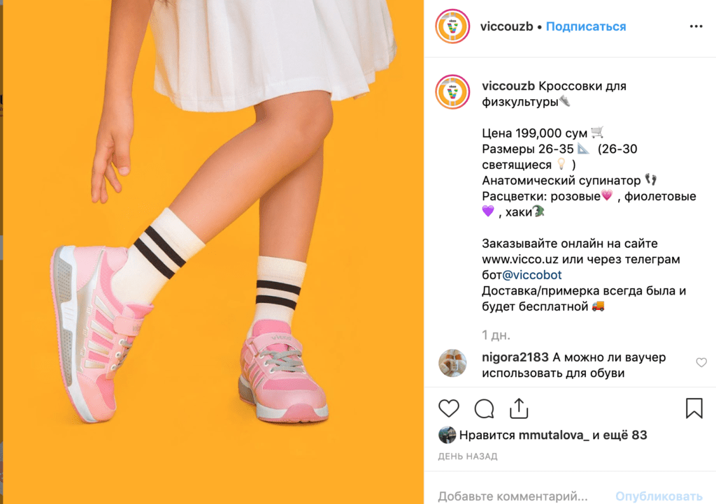 Или зайдите в магазин детской обуви Vicco. Вместо того чтобы просто делиться фотографиями обуви со стандартными описаниями, они демонстрируют обувь в школьной тематике, чтобы обратиться к соответствующим покупателям. Такой маркетинг одежды или обуви заставит не только вспомнить человека о предстоящем сезоне, но и задуматься о покупке у вас. К примеру магазин Twinkle (у которых мы брали интервью) сделали также.