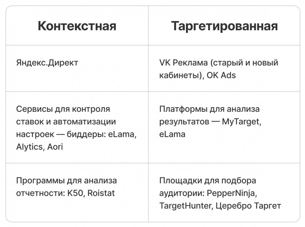 | Охват | Таргетинг, контекст, блогеры, оффлайн-реклама | Сделать компанию заметной |